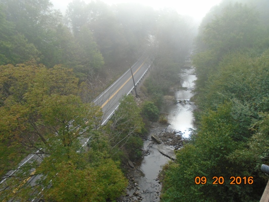 We chose to ride out of Meyersdale both ways, since the continental divide, the highest point on the trail, was about eight miles out of Meyersdale. So we took off in the foggy wet morning, riding south going uphill. It was hard to ride in the fog and mist. Joe was still getting over an inner ear and sinus infection and had trouble breathing for the first leg of our trip. We rode over an old iron railroad bridge which spanned a stream and country road far below. Even with the fog swirling around us, we were gifted with breathtaking views. The path is made of fine crushed packed gravel. It seemed to be fine for our bikes, even the two with skinny tires.