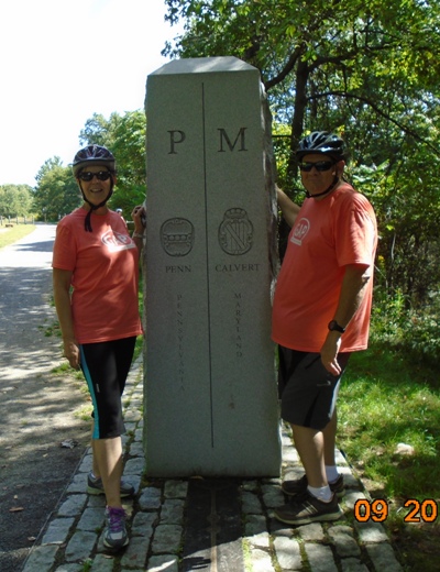 A few more miles down the trail, we crossed the Mason Dixon Line that marked border between two states. We stopped to get photos; Joe stood in Maryland, me in Pennsylvania. Always on different sides of the line. Ha Ha! The last 10 miles of the trail followed a functioning railroad track right into Cumberland. Thank God no trains came by as we rode. It was hard enough to dodge all the large gravel that made its way into our path from the track bed. But the scenery was magnificent. Across the tracks ran Jennings Run Creek. The white water rippled between and over large boulders. Great walls of granite rose on our right. I did not realize that parts of Maryland were so mountainous and remote.