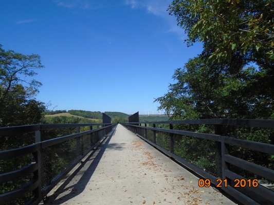 The Big Savage is an abandoned railway tunnel built in 1911, which has been re-purposed for recreational use, as is the Borden and Brush Tunnels (which we will also ride through). Savage is the longest tunnel on the trail, burrowing 3,295 feet through Savage Mountain. It was scary going, even with our headlights on and the row of dim lights in the ceiling, as we were still riding downhill trying not to brake too hard. I felt disoriented because I could not see the walls of the tunnel, just black on both sides. Joe said he felt like he was going through a “worm hole”. After we emerged into the sunlight there was a rest area, with picnic tables and benches where we could stop and take in the spectacular view of the valley below. Behind us was the mountain ridge where there were rows of wind turbines, all turning slowly in the blue sky. We saw them ahead of us before the tunnel, and now they were behind. We had just rode under them in the tunnel.