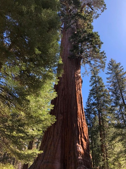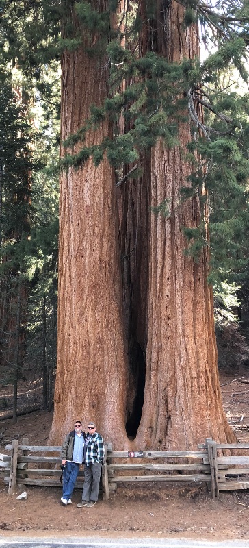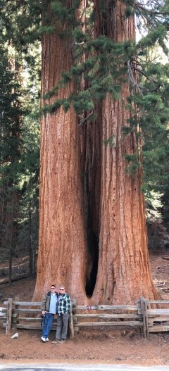We continued north towards Kings Canyon Visitor Center and Grant Grove Village, stopping at numerous pull-offs along the road to take in the massive trees. At Grant Grove we parked in the lot and trekked along a path to see more awesome mammoth Sequoias, all of them behind a low wooden fence with “Keep Out” signs. We behaved and did not jump the barrier in order to get closer to the trees for our pictures, even though without the proximity of a human, the photos do not capture the enormous size of these monsters. And of course our little camera lenses and cell phones could not take in the extreme height of The General Grant, the second largest tree in the world. It is a 3,000 year old behemoth that is 270 feet tall and 107 feet circumference at its base. The largest tree (they are measured by volume) is The General Sherman which is further south in the park. The Sherman stands 275 feet tall, and is over 36 feet in diameter at the base, 102.6 feet circumference. Sequoia trunks remain wide high up. Sixty feet above the base, the Sherman Tree is 17.5 feet in diameter.