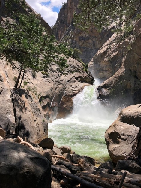 Since none of us were planning to hike to Canada, nor could we if we wanted to, we had to drive back the way we came, west on Kings Canyon Road. We pulled off at Roaring Falls and walked the quarter mile or so up a paved path to get a good view of the cascading water. Nothing compares to the rush you experience when you are in close proximity to thousands of cubic feet of water falling and roaring and rushing past you. There were many others waiting behind us to step up to the barrier to experience the falls, so we were unable to spend any meaningful time in that place. So me and Joe headed down a dirt path that weaved around and between boulders and trees toward the pool below the falling water. We got close to the edge and sat on a rock to take a selfie. Ron came down behind us with Rita following him.