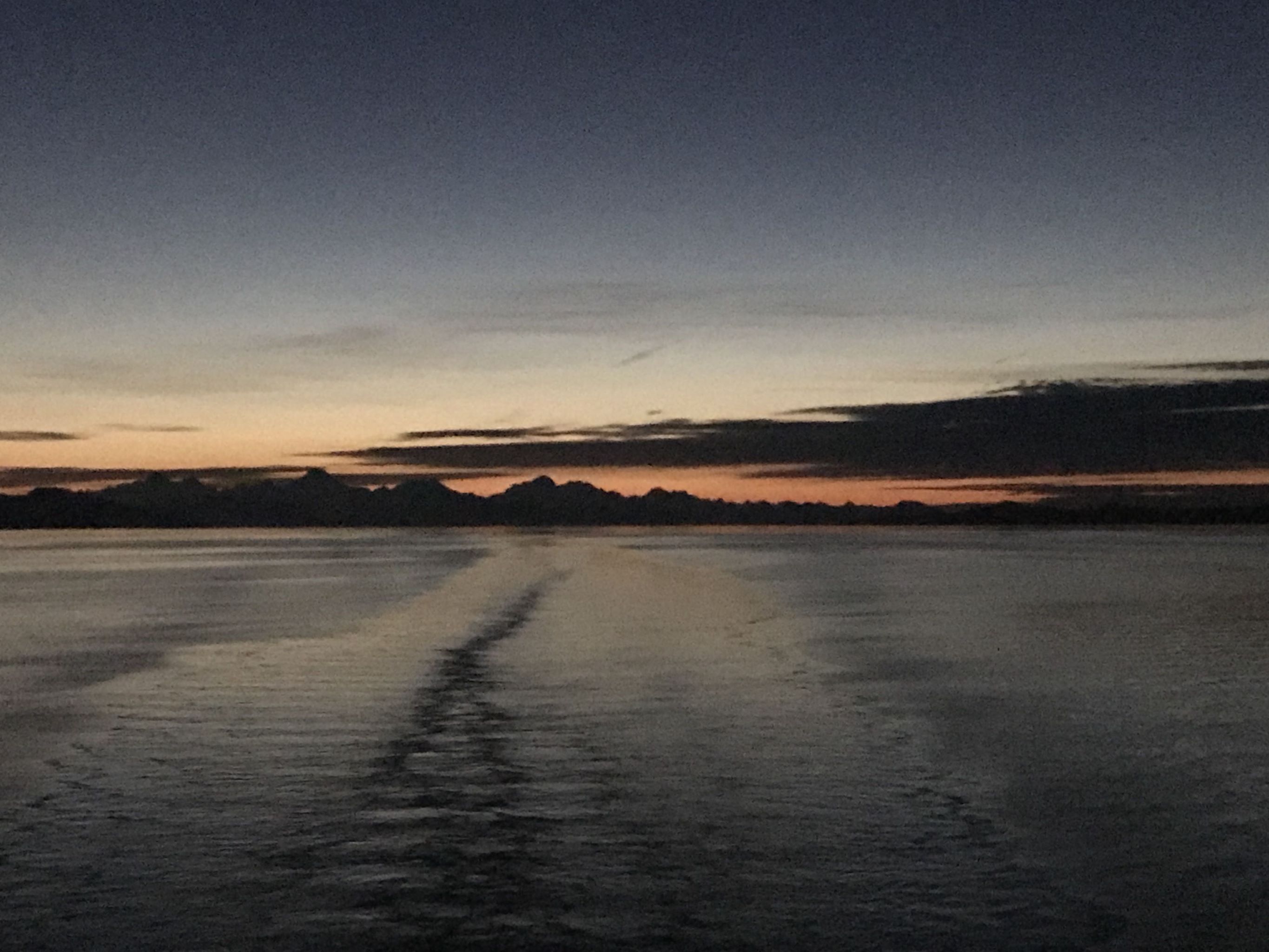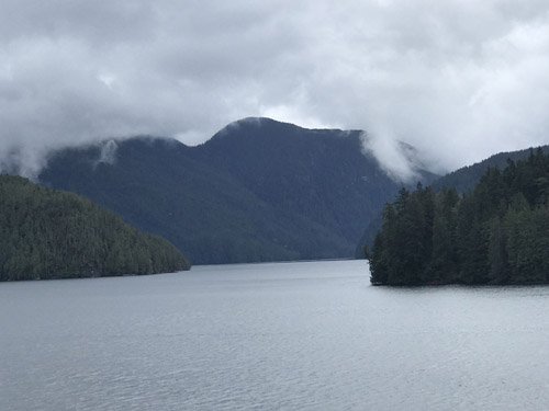Back in our cabin we got a start on our packing then headed out for dinner around 5:30 at the Lido Market. Afterward we sat outside by the pool and watched the land rock as we made our way south between the many islands and peninsulas. We were traveling through the Inside Passage, the water route between the Gulf of Alaska and Puget Sound, on our way to Vancouver. We had totally missed the Tungass Narrows when we left Ketchikan the night before. The Narrows is a Y shaped channel which is part of the Alaska Marine Highway, used for commercial fishing and sea craft. It is the first leg of the Inside Passage, which we were navigating through. The land on both sides of our vessel was mountainous and rocky, dotted with evergreens. Again whales were spotted, hard to really know what we were looking at out in the dark choppy water.