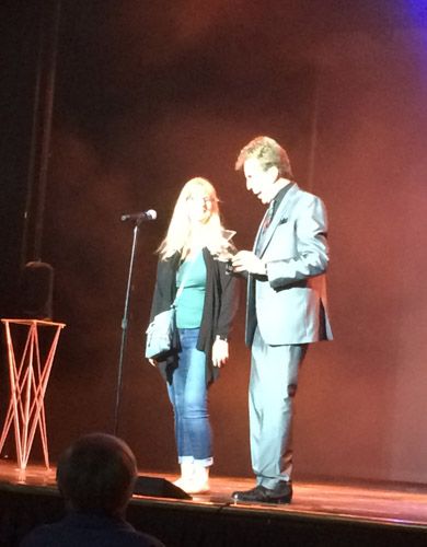 We tried to save the row in front of us for the other 3, the Hoppers and Gloria, but as the seats starting filling up, someone asked if they could sit there, we said sure. It didn’t seem right to hold them when people needed to be seated. A little later Rita and Gloria came down (Ron was resting) and needed a place to sit. So I said “You can squeeze in here,” pointing to the space at the end of the semi circle sofa we four were on. We each had two small oval tables with our drinks sitting on them. It was not pretty what happened next. All I’ll say here is if this was a scene in a comedy movie we were watching, we’d all be laughing uproariously. JR and Jcakie’s drinks, went down, dousing the gentlemen in front and soaking the floor and table. A virtual deluge. Gloria got out of her seat and went to get someone to clean up the mess, but the only help she got was another skimpy napkin. No one ever came over to deal with it. The lights went down and the MC introduced Jeff and Indy. Gloria found a better place to sit, while Rita tried to mop the sticky mess into an empty glass with one napkin. I felt really bad for them and was embarrassed too. But the show went on and the mess remained. Halfway into the show, Jeff came down the aisle looking for a woman to help him and he ended up behind Rita, admiring her ring and asking her to join him on stage. She tried to demure, really not wanting anymore attention, but at his insistence she ended up on stage. On her way up she told him her hands were sticky because she had spilled a drink. But he did not mind. We watched and laughed as Jeff took her ring and proceeded to lose it, chew it up in a grinder and toss it out with crumbled tissue. Finally Rita was able to retrieve her ring with a quarter Jeff gave her from a gum ball machine. Everyone was entertained and gave them both a big round of applause. The show ended when Indy the Magic dog, who was adorable by the way, came careening across the stage in her little red convertible. Show over we headed back to our room, in a hurry. I did not want to see the faces of the people in front of us who may still be upset about the unwelcome sticky showers.