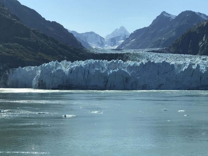 Lido deck to try to get some lunch before we got to the glaciers, but as soon as we sat down and had our drinks a voice over the intercom announced that the first glacier was coming up on the left or port side and the best place to view would be on the top deck. So we jumped up and headed outside. It was a beautiful sunny day, a little cooler as the boat neared the glacier. We ran into the Hoppers and Gloria on the Observation Deck, a semi circle deck on the uppermost bow. The area had a high plexiglass wind guard to keep passengers from going overboard. [Glacier photo here] Gloria calls this area the “Jack and Rose section” in reference to the movie Titanic. We ended out sitting on the deck chairs enjoying the cool breeze and bright sun as we slowly moved in to view two more glaciers close up, the John Hopkins (I don’t know how it got its name) and the Margerie. The ice on either side of the glaciers reminds me of dirty hard crusted snow piles in parking lots in late winter. You can see the silt packed along the outside edges, picked up as the glacier moves through the earth. But the sunlight penetrating the heart of the ancient ice gave off a spectacular blue hue. No snow or ice I have ever seen comes close to it. At one point we could hear the ice cracking and I even saw a big chunk break a way and crash down into the water. This is called calving. Of course I did not have my camera ready to catch the event as it happened, but here’s a you tube video of someone who did. (Be patient and stay with it for at least 30 seconds to see the massive glacier slag crash into the water and the after effects on the camera-person.)
