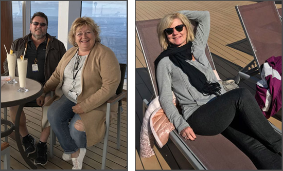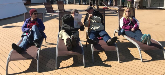 At eight we all met at the Vista Lounge deck 2 for the show. The MC could have been the twin of the Hunger Games host sans the blue hair as he introduced tonight’s star, a tall bald comedian whose name I do not have. He was funny, doing great impressions of many stars, Jack Nicholson, Robert De Niro and Johnny Carson, to name a few. But some of his material was dated, as evidenced by a Michael Jackson skit that included dangling a doll on a string.