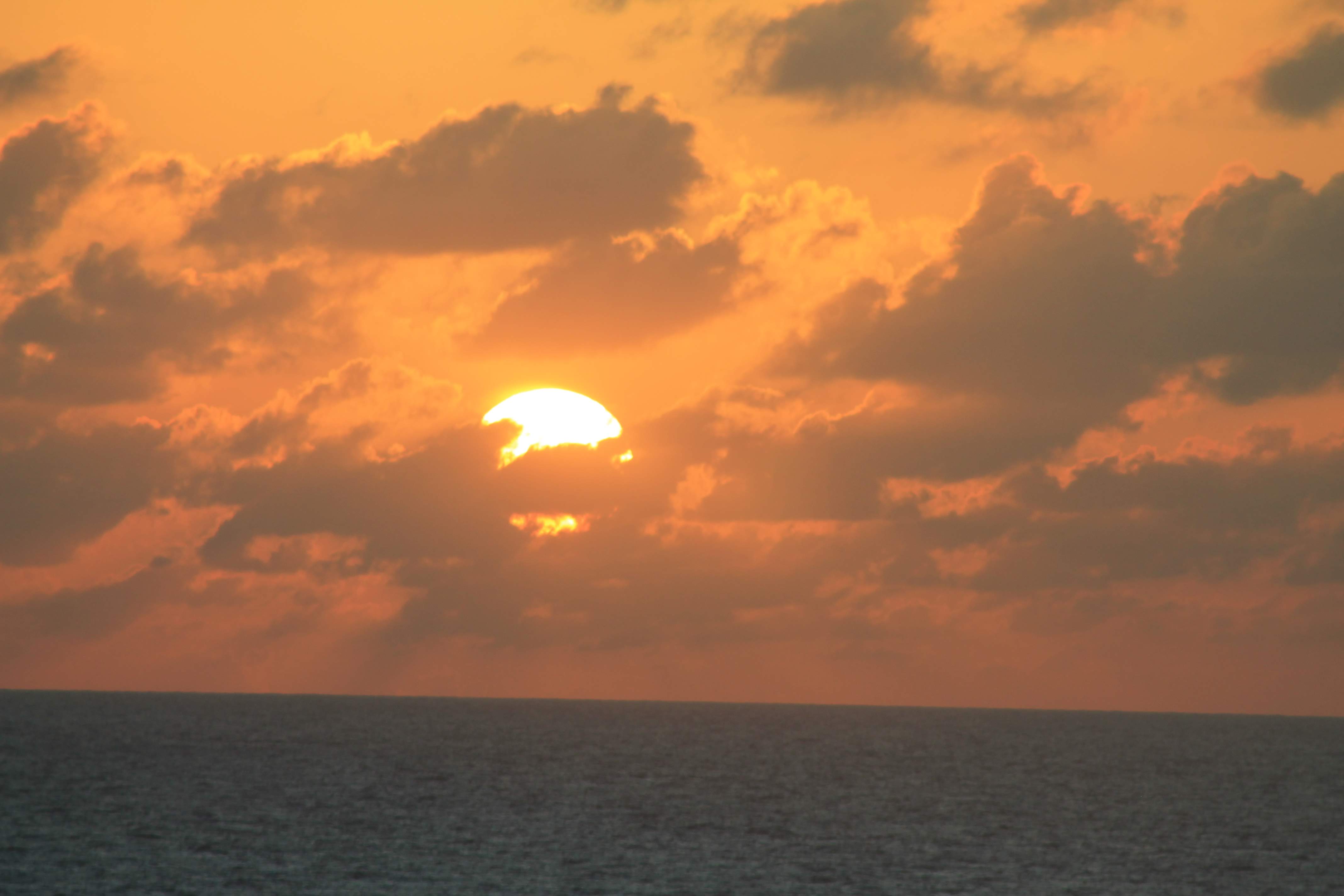 Our last night. We sat on the balcony. The ship was slicing through the dark water heading north in the center of the Gulf of Mexico. The sound of the waves rolling away from the boat sounded just like the waves on a beach. I had a glass of wine. The moon was big and orange, rising out of the ocean. A harvest moon with no land.