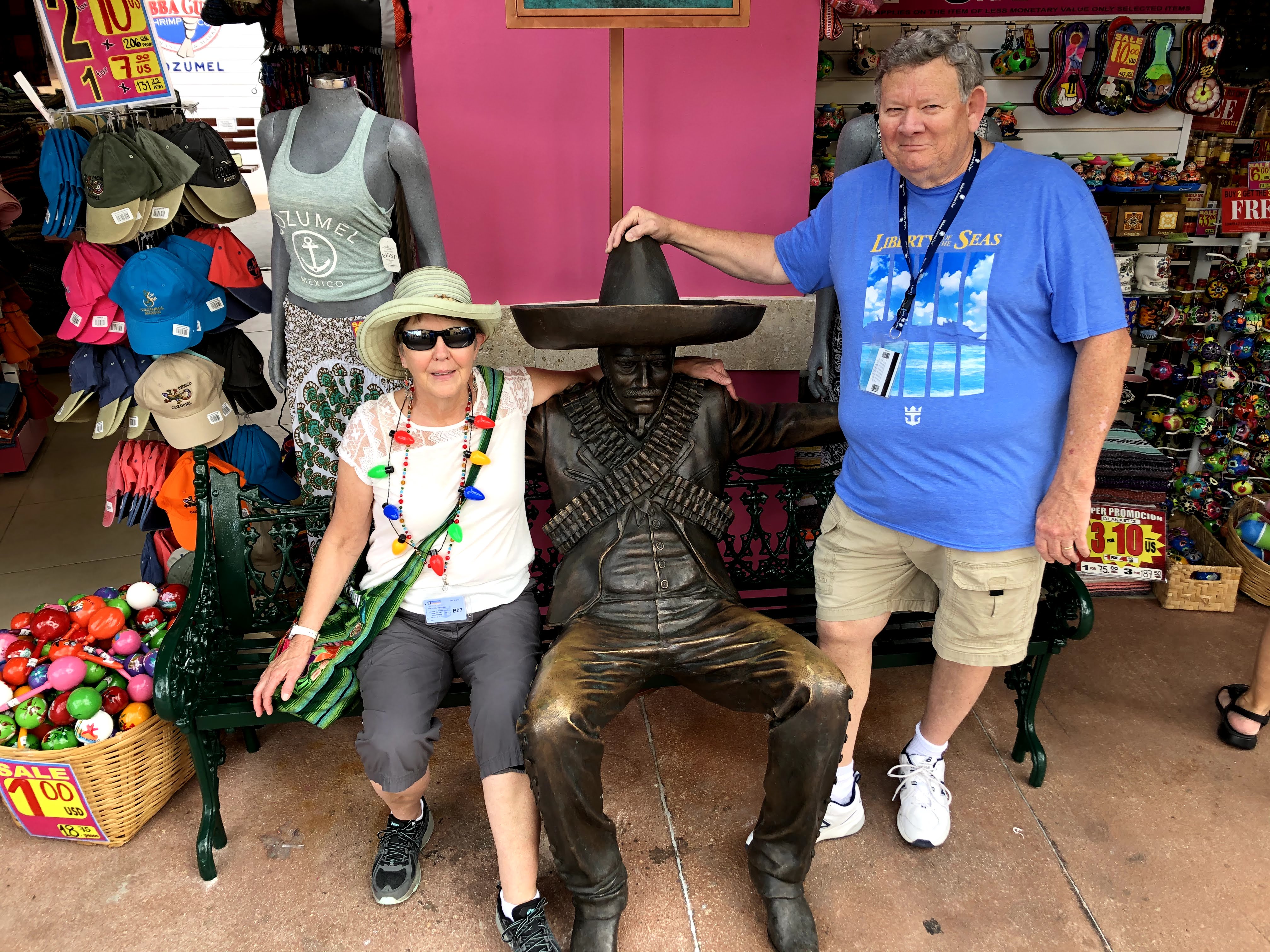Lunch over and Godfather selected we all boarded the bus with our little star piñatas. Back in Cozumel, getting back onboard the vessel was an ordeal. A long cattle line, going through the same security I was subjected to early that day. Back in our cabin, we showered and rested. I dressed to the 9s, wearing my new blingy top and black flowered pants and jewelry. We, me and Joe, went to Deck 3 Studio to hear the presentation 30,000 years of Art History. It was great. Rudy showed up too. I learned so much about the masters and the time line of each era starting with cave art all the way to the pop art of Andy Warhol and Peter Max.