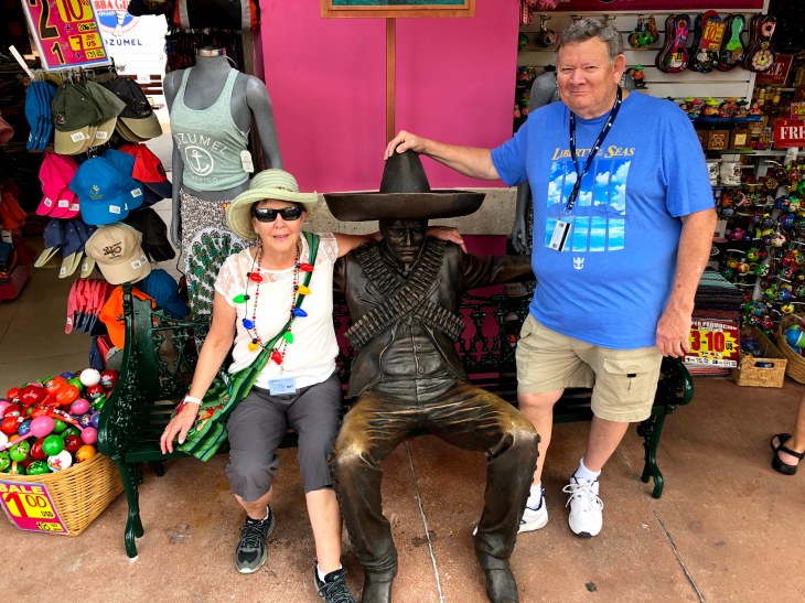 Up at 7, coffee and breakfast in room. Out early to town of Cuzomel. This is a much bigger city than the previous stop. We walked around a bit, exploring the many shops, and I purchased a beautiful flowing bling bespeckled top and Joe got another T-shirt. He enjoyed haggling with the vendor to get a better price on his shirt. At another shop I found a wood painted statue of the Our Lady of Guadalupe. I love the Virgen de Guadalupe. And Joe got a small plaque of the Mayan calendar. We had about 40 minutes before we had to meet to board our bus for the Mexican Christmas Excursion, and I did not want to carry around my purchases during the trip, so I decided to take them back to the boat. I also got Joe’s bag and said, “Wait here. Shouldn’t take more than 20 minutes.” I was wrong about that. I had to get past the guards, who forced me to go into a tent where I could be processed as I was leaving the country of Mexico. There was a short line. We each were sniffed by a drug dog as we put our bags and stuff on the conveyor to be X-rayed. My travel bottle, which I had filled with ice before leaving, was opened and sniffed. I thought they were going to pour my precious cold water out, but they didn’t. I suppose they wanted to make sure I was not smuggling alcohol out of Mexico. My knee brace set off the metal detector, so I had to remove it before proceeding through security. I was eventually released and I hurried the whole length of the pier, up the gang plank, elevator to 12th deck and then to our room where I left the two bags. Back the same way, through security again. I would not have made the effort if I knew it would be such a hassle. The whole trip took over 30 minutes. I could feel my phone vibrating as I hurried along toward our meeting place. (We now had texting available on shore in Mexico, thanks to Joe replying “Yes” to a prompt he received on his phone regarding international service.) When I got back everyone was waiting for me. I explained about the security delays I had encountered on my foray to the boat and back as we headed toward our bus to do the Mexican Christmas.