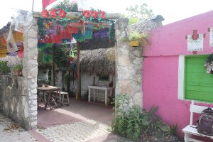 After a short drive, we debarked in a small community and Rosanna first led us through a beautiful diverse garden, then to the oldest Catholic church in the area, built from the stones of the Mayan Temple ruins that were right next door. First we toured what was left of the Mayan temple, dark moss covered stones, mostly crumbled, but the structure was still evident with a small rectangle entrance. Rosanna said it was fitting to have remnants of the worship of ancient deities included in the Catholic Church as the practice of the Catholic religion in Mexico is inundated with native rituals and symbols.
