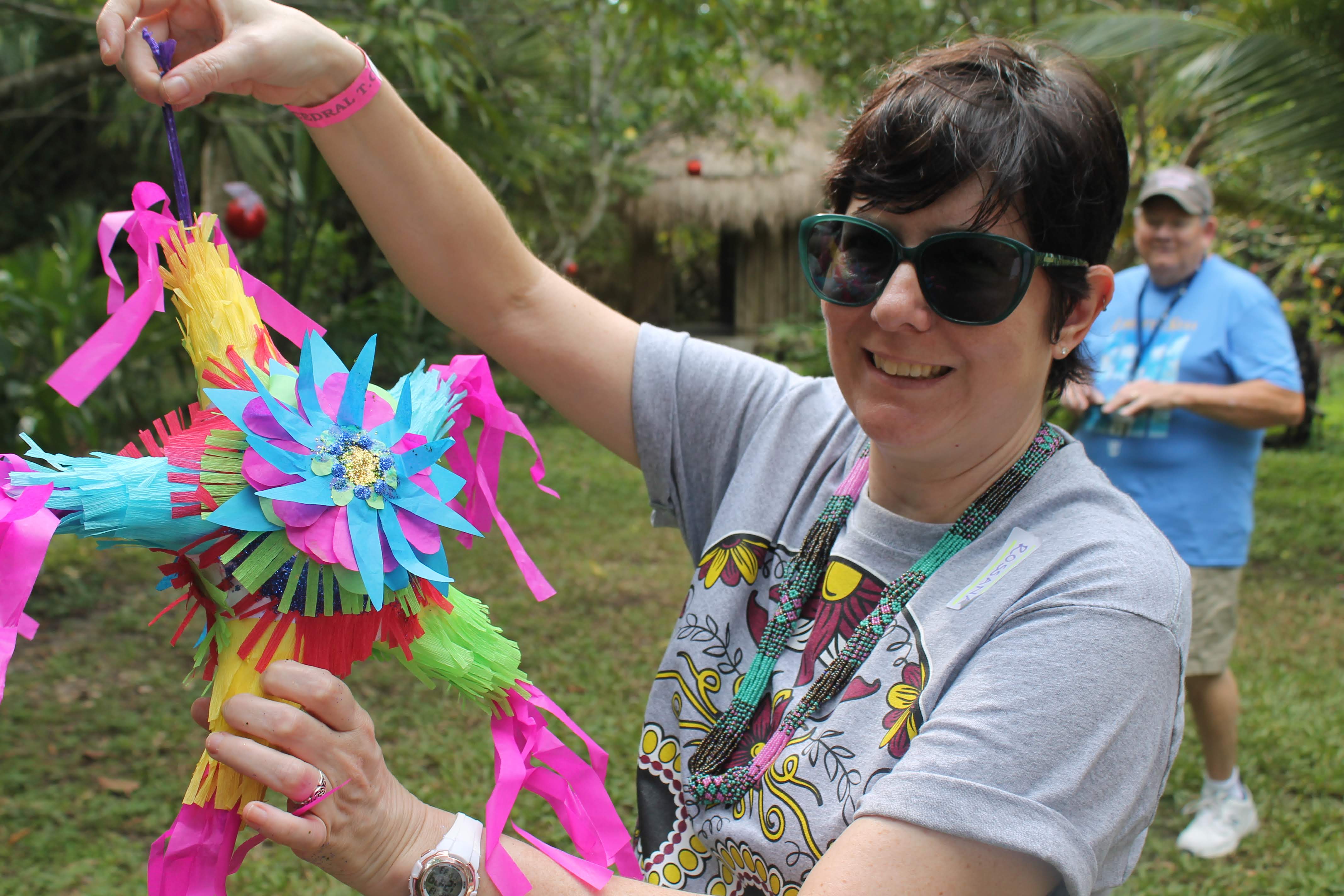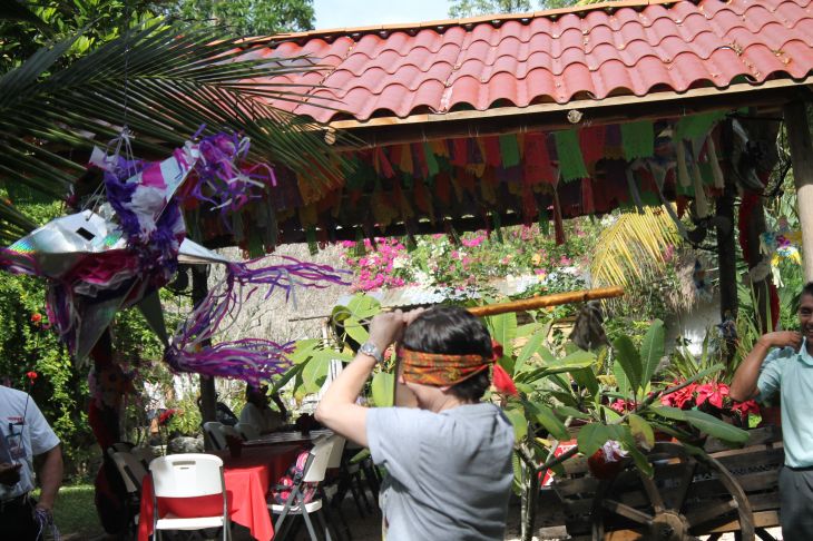 Before lunch we had one more group activity, the breaking of the piñata. As we were working on our projects, our hosts had been hanging a large star piñata from a tree branch. We were all instructed to form a circle around the swinging star and cheer as one person stepped forward, was blindfolded, handed a stick and proceeded to swing at the dancing star full of candy. Rosanna did warn the first persons up to not whack too hard as we wanted the piñata to stay intact for others to take a swing at it. The first two up to bat made contact but no breaks. Jackie took a turn, and did quite well, still no candy though. Deloris was itching to get a hold of the stick, and when she did she took that star out of the ballpark with a swing like Babe Ruth. A fault opened in the swinging vessel and candy spilled out. Joe and a few others, scrambled on the ground grabbing treats to put in the colored bags we were each given. A few more took their turns at the piñata and soon we all had bags of hard candy with names on the wrappers that we could not read. Lots of hot suckers and some Mexican version of the Moon Pie, which I took from Joe’s bag and ate. Someone suggested that Joe should share some of his hall with the others, since he seemed to have acquired more candy than anyone else. He said, “No, I aint’ doin’ that.” To me he said. “I grew up in Over the Rhine. Where you snooze you lose.