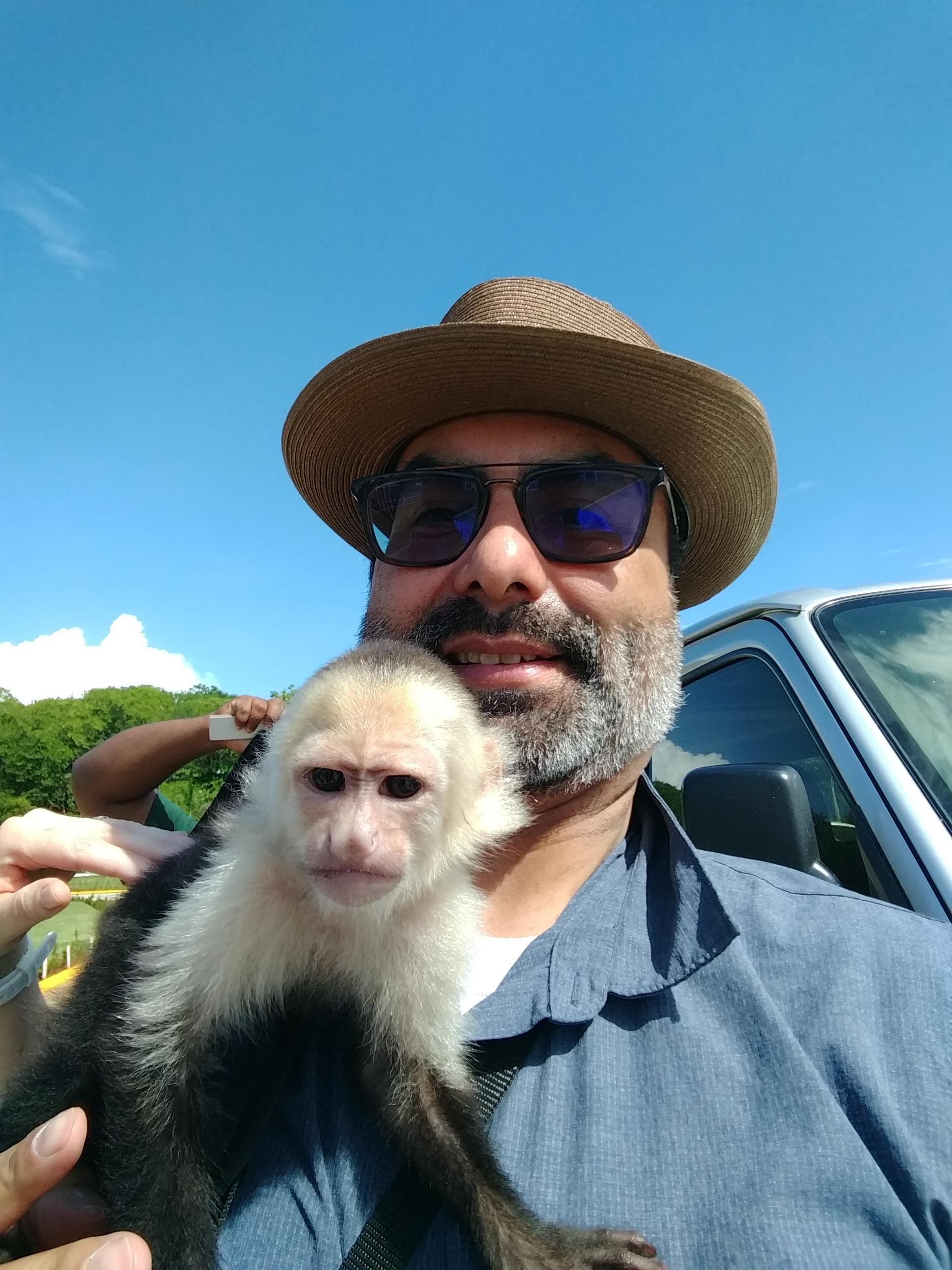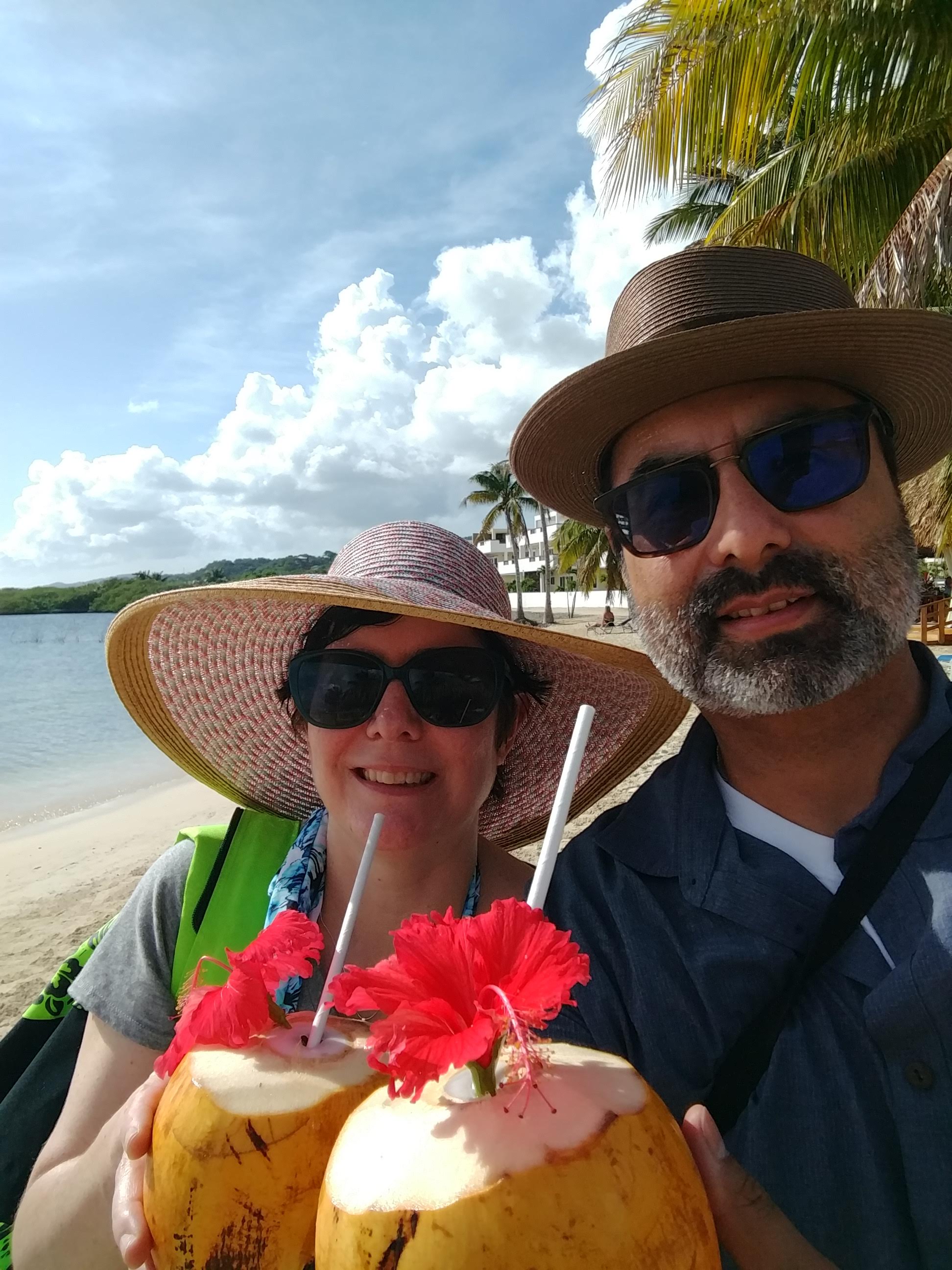 Joe bought a T-shirt. He likes to buy Ts with places he’s visited on them and he does wear them. I bought a small handmade cloth carry-all bag. It has a long shoulder strap and is green, with multi colored bright flowers embroidered on the front. I especially like that it was made in Honduras, not China. I plan on using it instead of my purse or the backpack for our excursions. We went back to the boat for lunch and decided to stay onboard. Joe and I went to the pool and relaxed on the deck with frozen margaritas. Dee and Rudy came by and showed us photos of their Eco Wildlife Adventure. Rudy had close-up pictures of flowers and plants, and birds. One cat and a dog. But the best photos was of Rudy and the monkey who seemed to take a liking to him. Part of the tourist experience I guess. They also stopped at a beautiful beach where they waded in the clear waves.