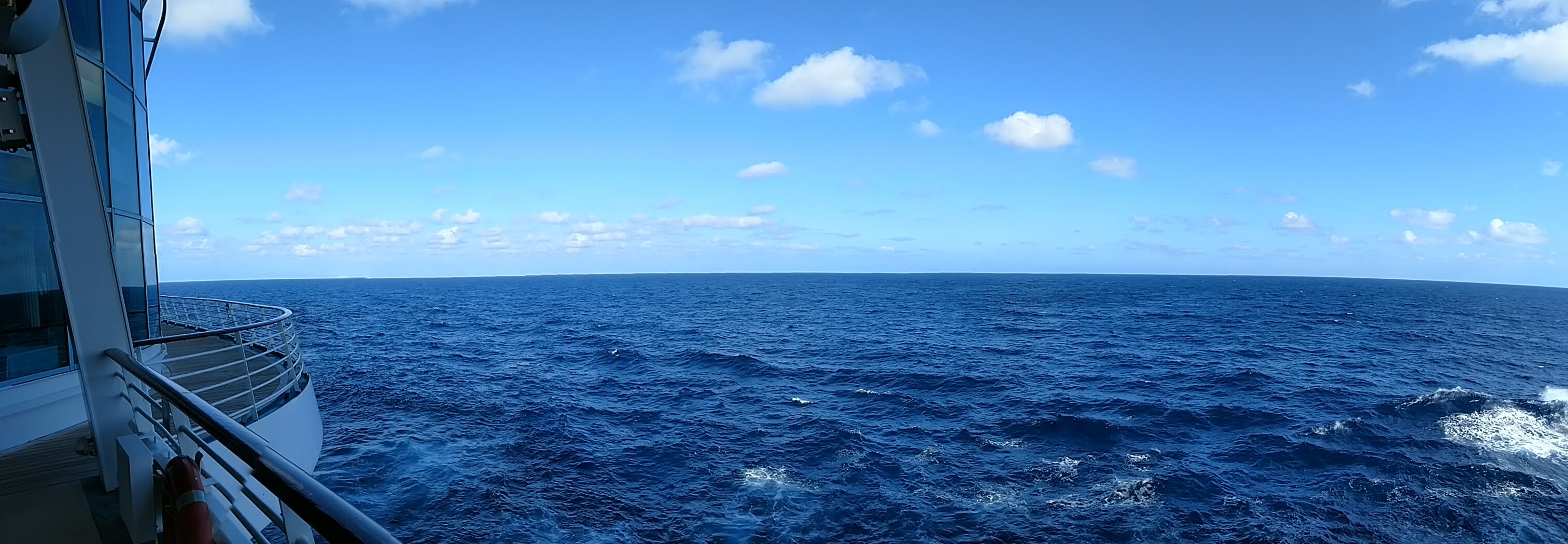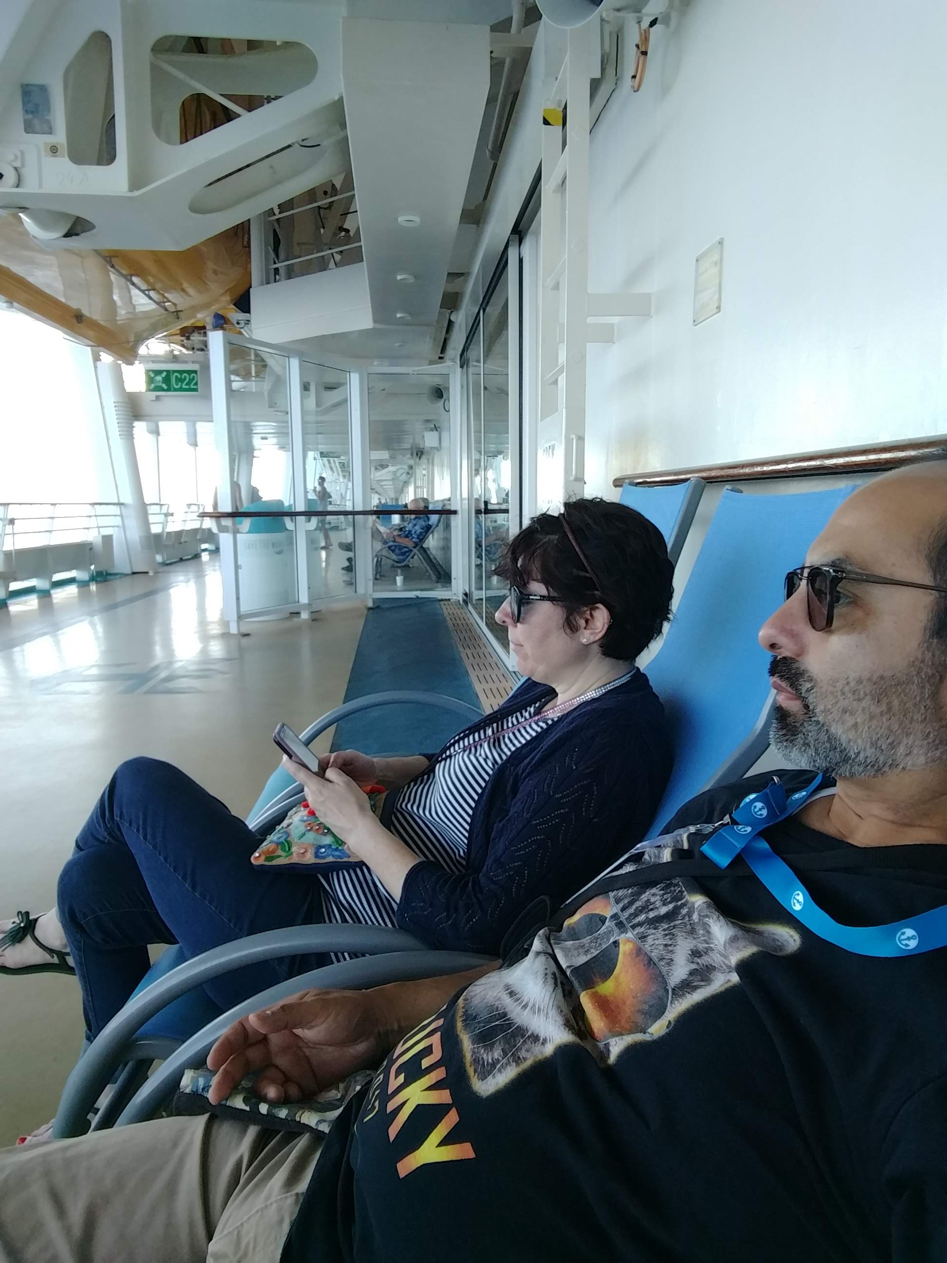 Lunch was again a great experience at the Windjammer. This time we watched ourselves and did not overeat. We ran into JR and Jackie there. We went our separate ways, exploring the ship. We tried to exit the elevator on Deck 1, but were told that unless we had a medical need, we’d be escorted off Deck 1 by security. Only crew were allowed to roam the basement of the boat. We ended up on Deck 12, the rear or stern of the ship, opposite of our state room, which is in the bow. There was a crazy water park, spanning Decks 12 and 13. A dual water tunnel slide, a surfing wave pool and a boomerang style slide. We made our way up to Deck 14 where there was some kind of court for sports, and then the very pinnacle, Deck 15 into the Skylight Chapel, a small room with church pews, a candle and stained glass skylight. No religious images or symbols, just color and light. A woman was sitting on the other side, but when she bent her head and we heard her weeping, we quietly left so she could be alone with her God.