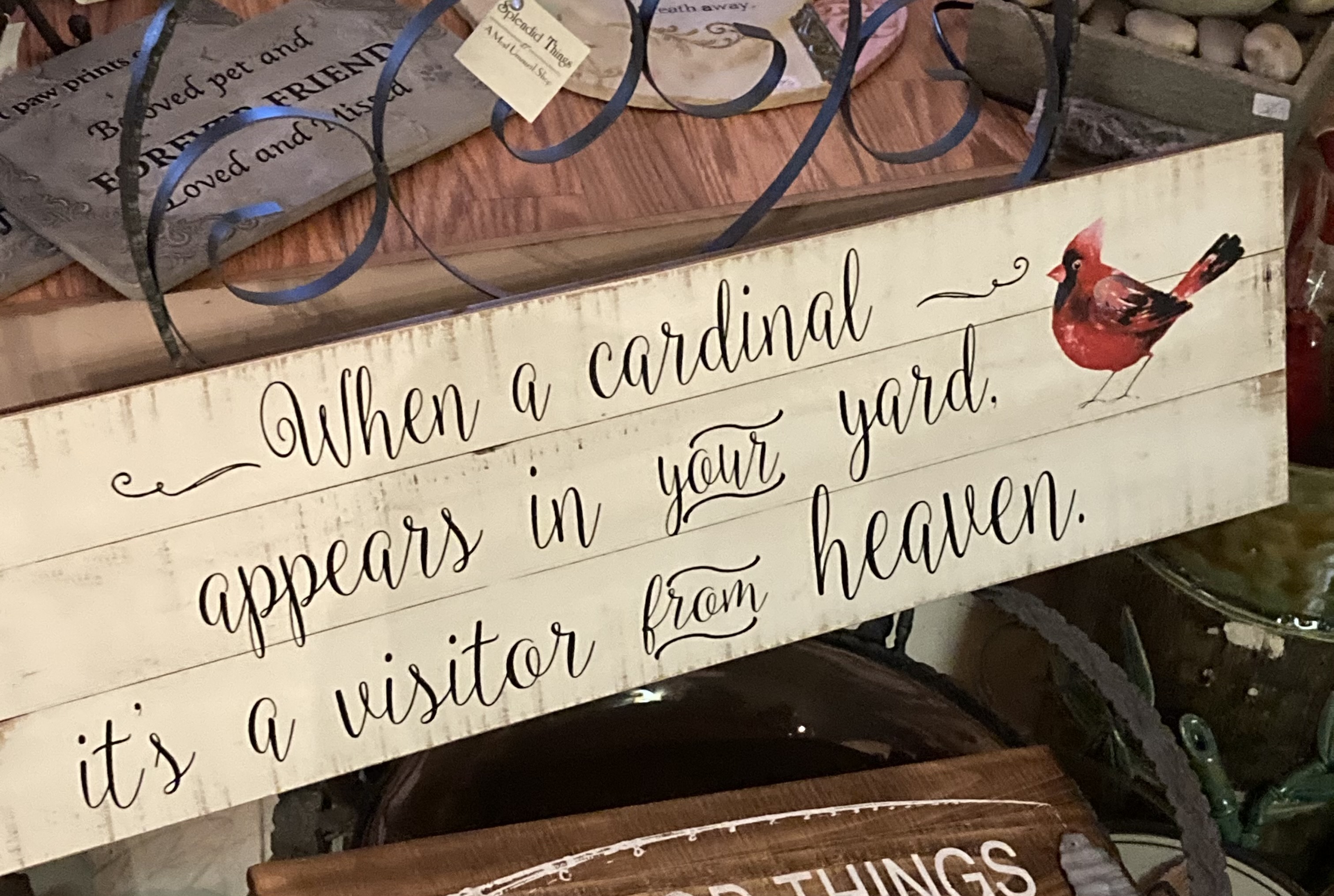 It was a cold, sunny day.  We started at Findlay Market, and then went to Bellevue’s small business district. We enjoyed walking through shops, and stopped for lunch. As we were heading back to the car, we just stopped in one last shop. The glass storefront had a myriad of items displayed. The one thing that caught my eye was a brown purse, western motif that looked like something Donna carried. A quick thought of her flashed in my mind, and then it was gone.  But, there it was… the second I walked into the store- a Cardinal- A sign- literally, a sign to hang. A picture of a cardinal with the saying “When a Cardinal lands in your yard, it’s a visitor from heaven”.  I stood there in a sort of awe, and said out loud, “There it is, a redbird”. Deb said “there are redbirds all over this place”. Then I saw-little redbirds lined up on a shelf. I briefly told Deb my ‘prayer’ requesting a sign if it was Donna visiting me. She flippantly said “well here’s your sign”, pointing to the painted sign with the trite saying; the one I had thought Donna made up, but apparently she didn’t because it’s a ‘thing’.