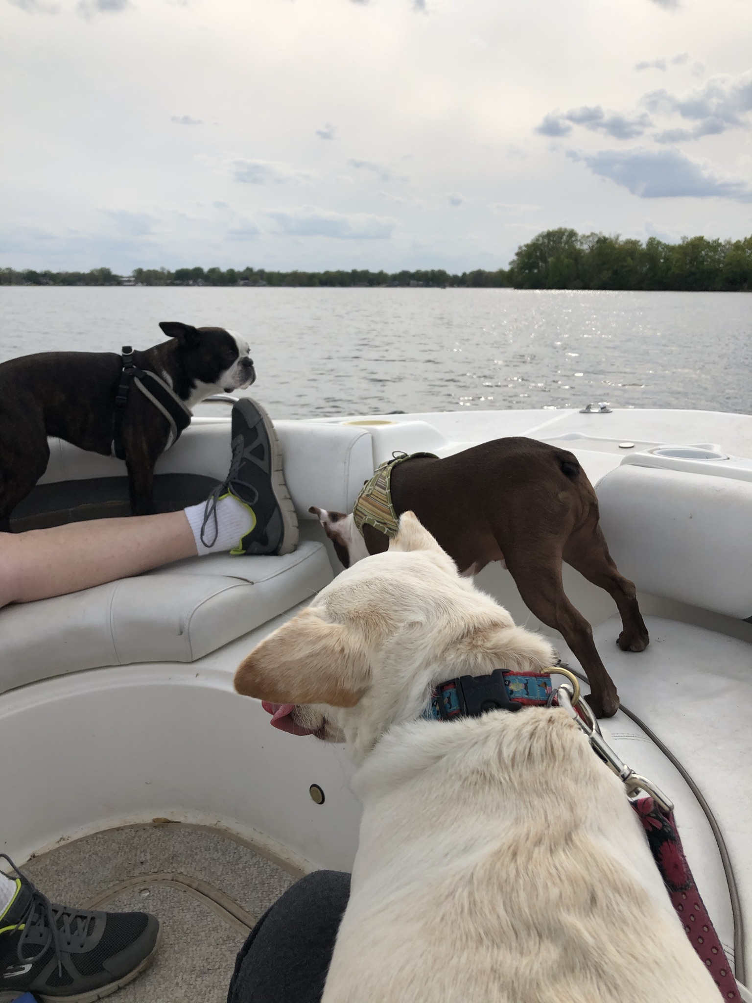 It started when she spent the day with her cousin Lenny and his older brother, Max, on the Island, a small land mass with cottage, 2 decks, fire pit, outdoor furniture and trees, all sitting in the middle of Lake Webster. Lenny is a crazy little brown and white Boston Terrier. He and his brindle colored brother, their human parents, me and Joe and Little Girl, our 2-year-old rescue dog of dubious parentage, headed out to the Island to help get it opened for the summer.