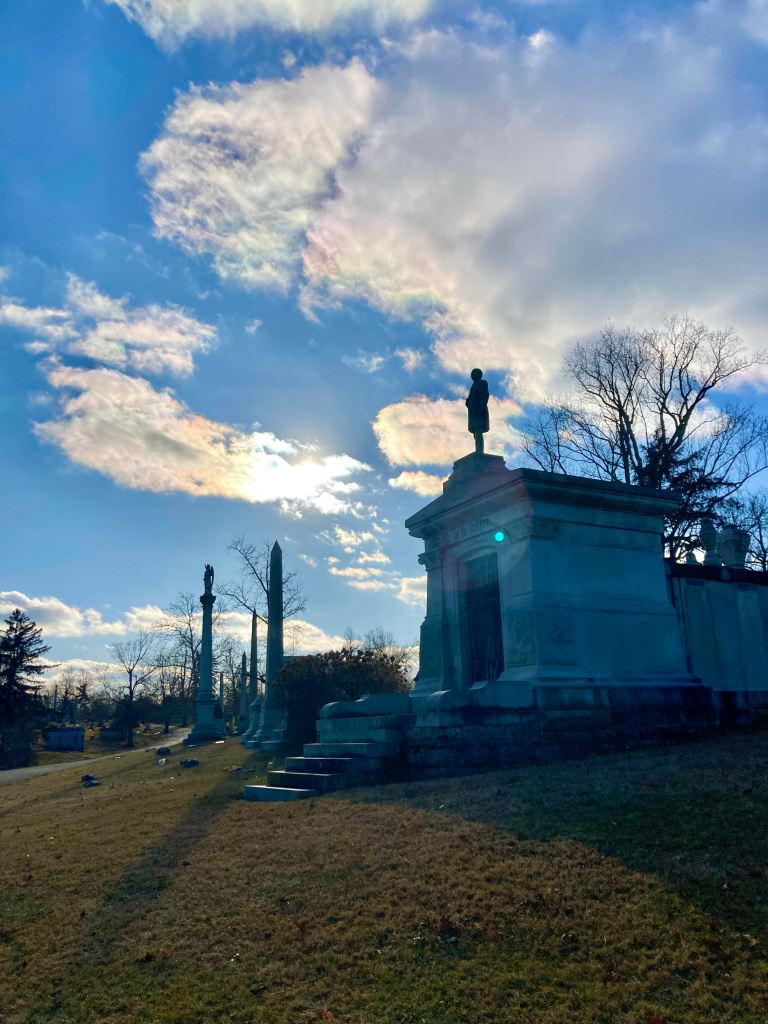 The sunny, frigid wind knifes at my cheeks, sharp, stinging and burning, no blood to prove it. My legs aren’t there, yet they keep moving stiffly forward. With Raybans aloft, I tilt and squint at the towering gothic monuments to death. A full blown statue of a man stands atop a concrete structure that is serving the purpose of a graveside guard. I don’t know who he is and why. Aside it are taller towers competing with it. These grand structures look down on the hillside of headstones standing in line. The occasional spooked balloon bobs about on a lone stick. A few leftover shiny bows still attached to tattered wreaths shows someone cares. The lake is glazed with ice today- the geese are not around- only the frozen poop dotting the paved lane. The sky is bright-baby blue with cotton clouds. I come here in all seasons and every graved hill holds its own beauty; with each holiday décor. The springtime here will be a feast for the eyes- flowering trees of purple and white. beautiful lush green lawns dotted with bouquets. Death and life coexisting.